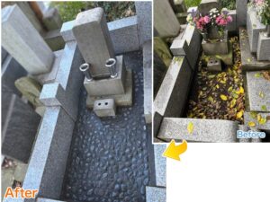 お墓正面です。色々工夫されて、デザインも凝ったお墓でした。カロートの前蓋が墓誌を兼ねています。まだ新しいお墓で、彫刻はありません。こちらに新しく一名の方のお名前を彫刻します。